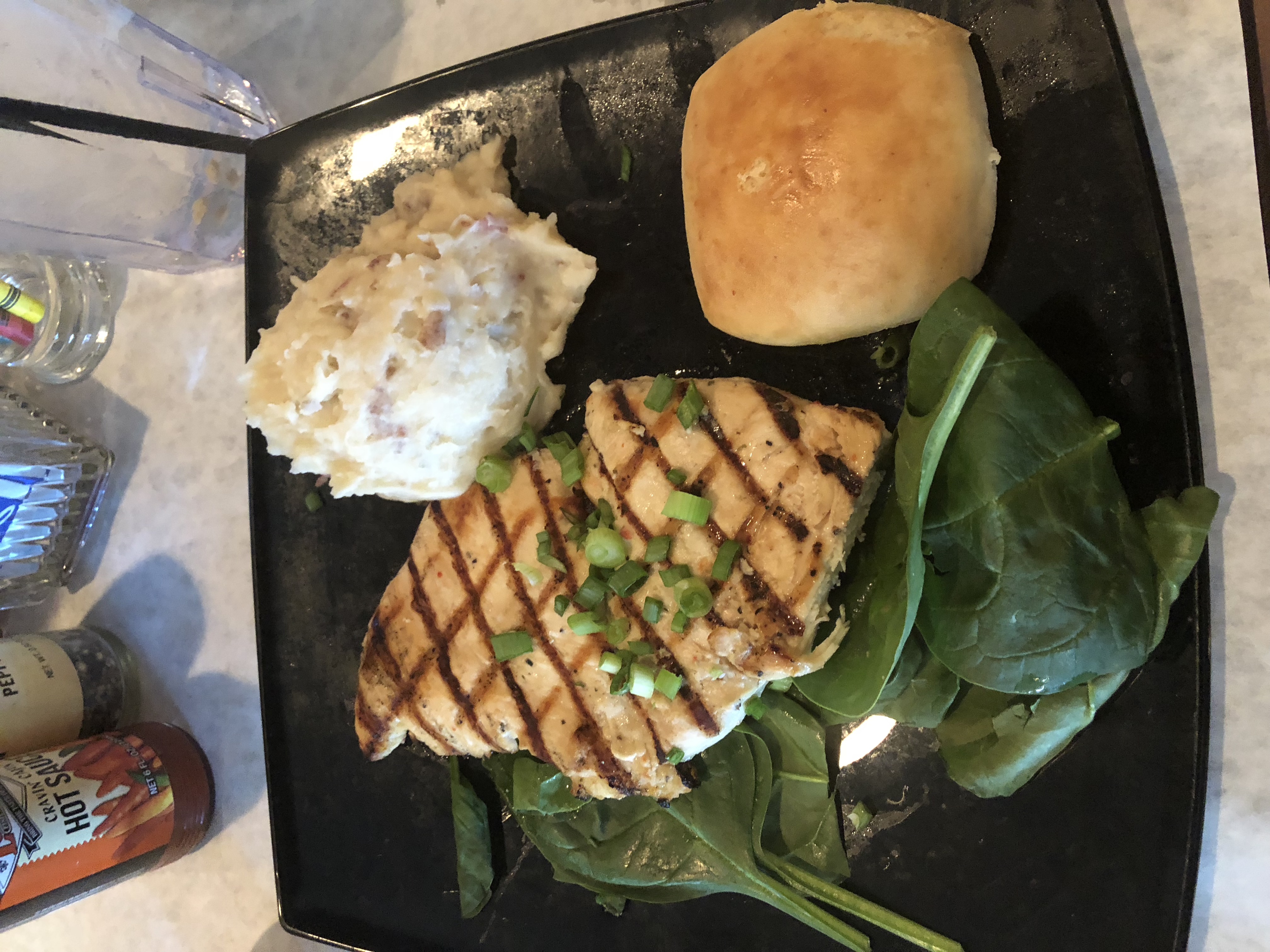 When I arrived at the hotel, I found that my sisters had sent me flowers for my birthday. It was my first time ever using the digital key option. THAT was COOL. I hadn’t eaten since breakfast and it was 4:00 so I walked across the parking lot to get some food. I’m thankful for that original trainer I told you about. I texted him and said, “What should I eat?” He said, “Carb up.” And he said, “Have bread.” So I ordered Chicken, spinach, baked potato, and bread. I could only eat half. I just wasn’t that hungry.